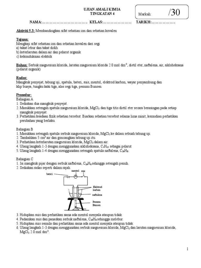 Laporan Eksperimen Kimia Tingkatan 4 Bab 3