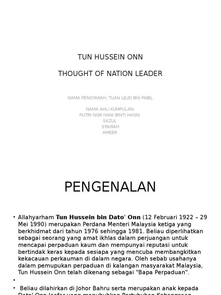 Latar belakang tun hussein onn. Beliau telah menerima pendidikan awal di sekolah teluk kurau singapura dan kemudian ke english college yang kini dikenali sebagai maktab sultan abu bakar di johor bahru. Allahyarham tun hussein bin dato onn 12 februari 1922 29 mei 1990 merupakan perdana menteri malaysia ketiga yang berkhidmat dari tahun 1976 sehingga 1981 beliau diperlihatkan sebagai seorang yang amat ikhlas dalam perjuangan untuk mencapai perpaduan kaum dan mempunyai reputasi untuk bertindak keras kepada sesiapa yang mencuba membangkitkan kekacauan perkauman di dalam negara. Pada 15 januari 1976 tun hussein onn menjadi perdana menteri malaysia yang ke 3 menggantikan tun abdul razak yang telah meninggal dunia di london pada 14 januari 1976. Moreover he was the member of parliament mp for sri gading from 1974 to 1981 representing barisan nasional bn and united malays national organisation.