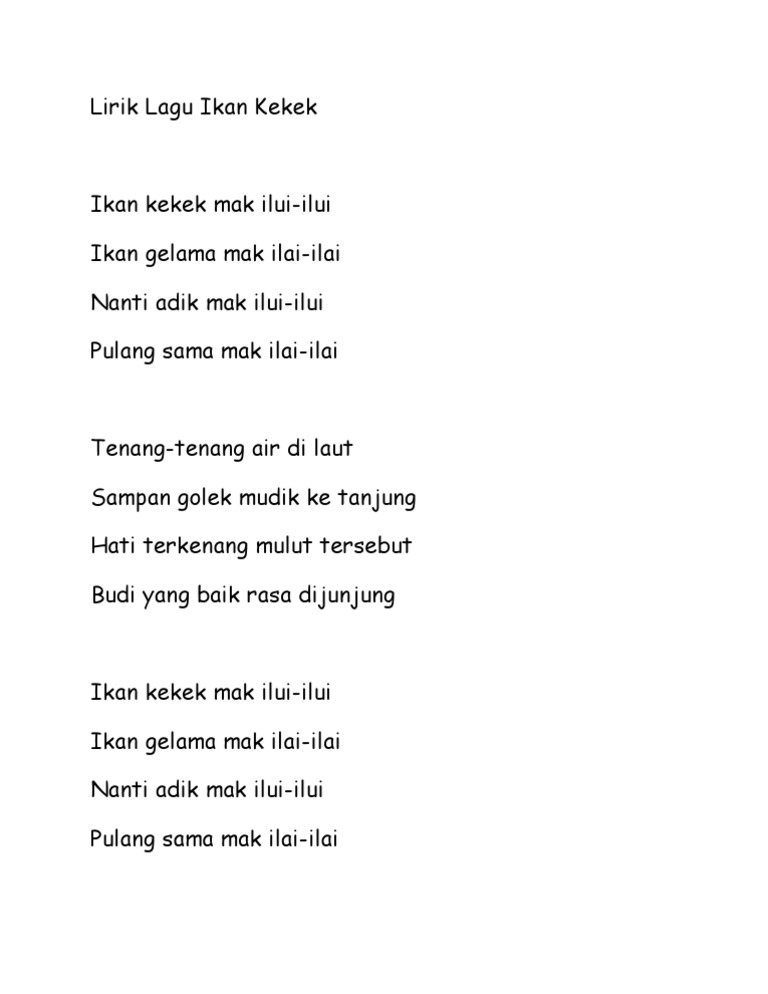 Lirik lagu ikan kekek nadir. Lirik lagu ikan kekek nadir. Lirik lagu ikan kekek dodoi si manja ikan kekek mak ilui ilui ikan gelama mak ilai ilai nanti adik mak ilui ilui pulang sama mak ilai ilai tenang tenang air di laut sampan golek mudik ke tanjung hati terkenang mulut tersebut budi yang baik rasa dijunjung. Lirik lagu ikan kekek nadir.