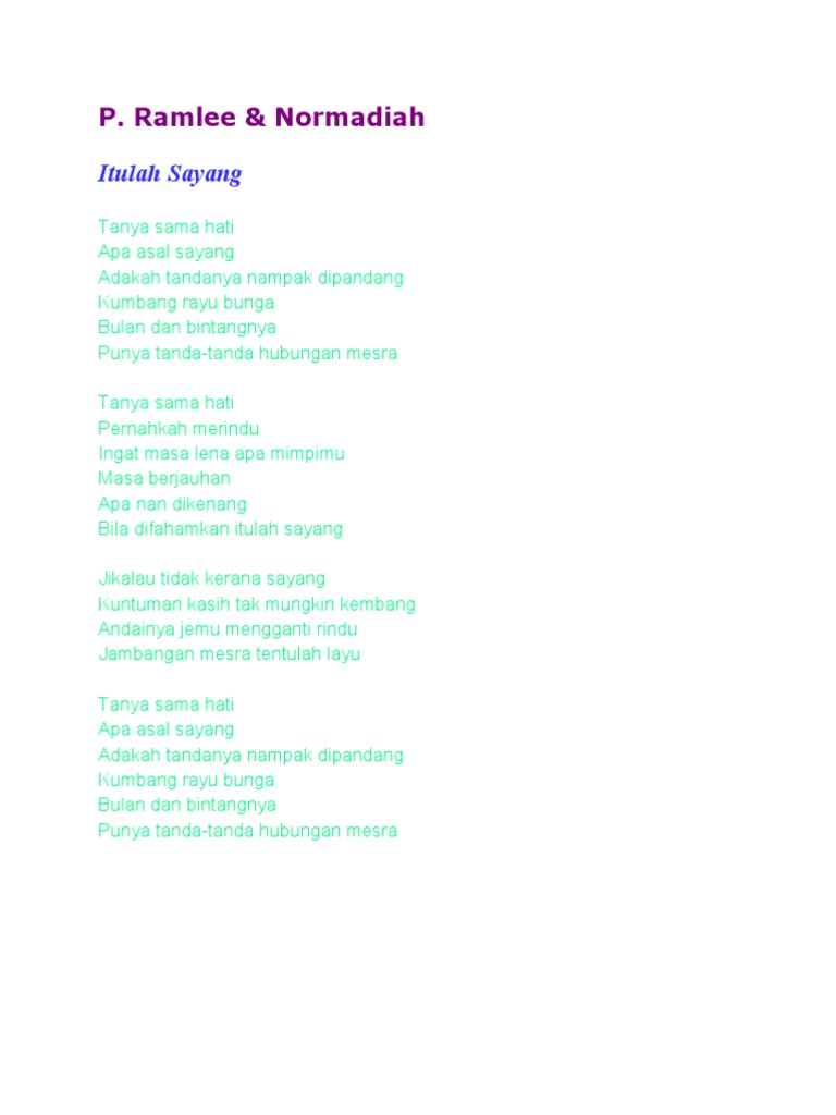 Tanya sama hati apa rasa. Ramlee tanya sama pokok tigok lagu lame2 xde org dega pun. Ramlee normadiah itulah sayang tanya sama hati apa asal sayang adakah tandanya nampak dipandang kumbang rayu bunga bulan dan bintangnya punya tanda tanda hubungan mesra tanya sama hati pernahkah merindu ingat masa lena apa mimpimu masa berjauhan apa nan dikenang bila difahamkan itulah sayang jikalau tidak kerana sayang. Awan nanti kata aku kandung air sampai tempat sejuk aku pun cair tengok dalam air nampak bayang bayang campak satu batu bayang pun hilang.