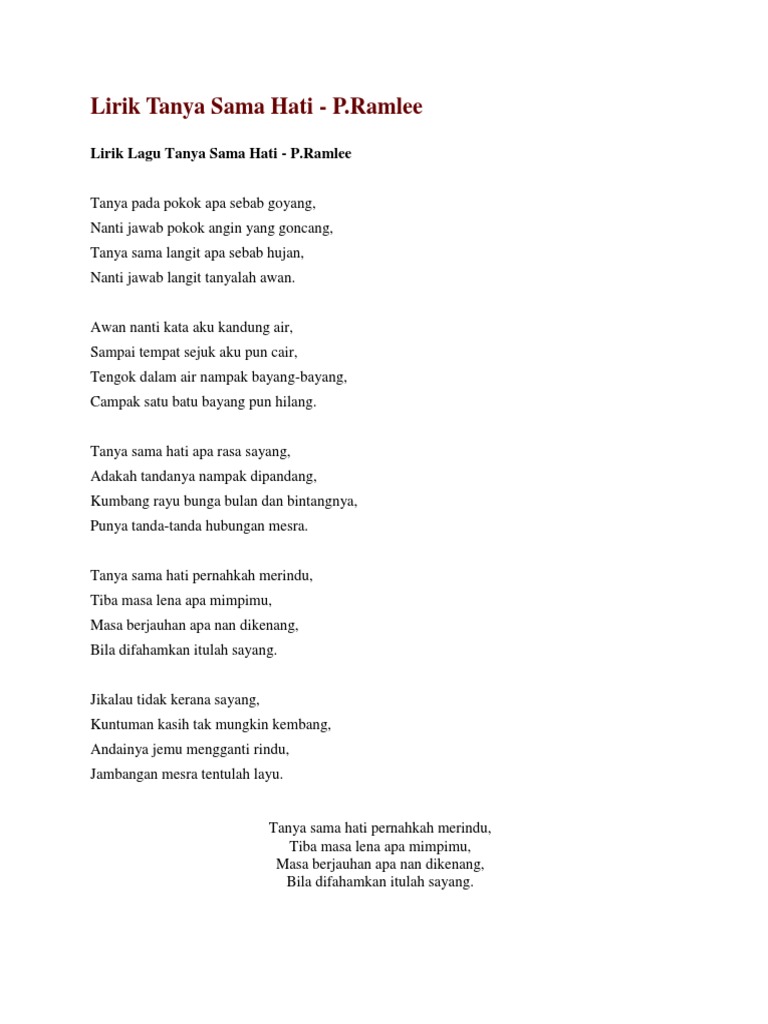 Lirik lagu tanya sama hati p ramlee tanya pada pokok apa sebab goyang nanti jawab pokok angin yang goncang tanya sama langit apa sebab hujan nanti jawab langit tanyalah awan. Tanya sama hati apa asal sayang adakah tandanya nampak dipandang kumbang rayu bunga bulan dan bintangnya punya tanda tanda hubungan mesra. Tanya pada pokok apa sebab goyang nanti jawab pokok angin yang goncang tanya sama langit apa sebab hujan nanti jawab langit tanyalah awan. Lirik lagu itulah sayang.