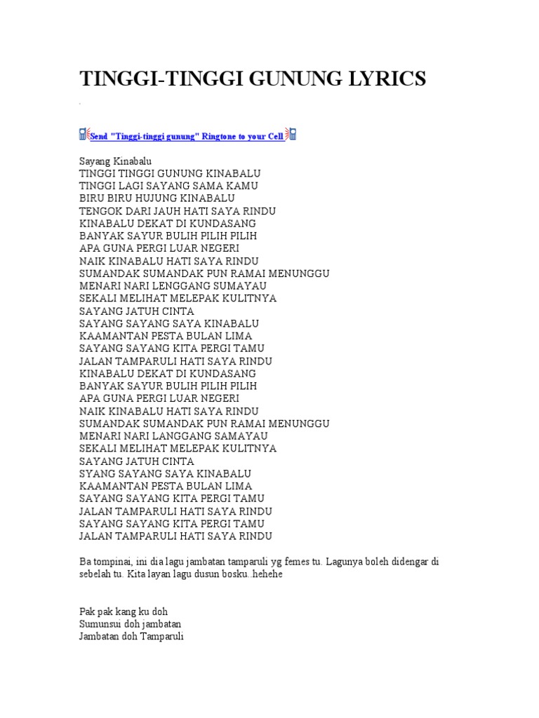 Tinggi gunung kinabalu reno. Sumandak sumandak pun ramai menunggu menari nari lenggang sumayau sekali melihat melepak kulitnya. Tinggi tinggi gunung kinabalu f g tinggi lagi sayang sama kamu am c biru biru hujung kinabalu g tengok dari jauh c hati saya rindu. Lebih tinggi dari gunung lebih dalam dari lautan lebih luas dari samudra itulah kasih tuhan ku karuniai aku akan kasih mu yang dunia tiada miliki anugrah mu ubah hidupku seturut dengan kasih mu hangatkanlah hati kami ya tuhan dengan kasih mu yang tulus dan suci untuk mengabdi kepada panggilan mu di dalam kehidupan dunia ini kasih mu adalah s.