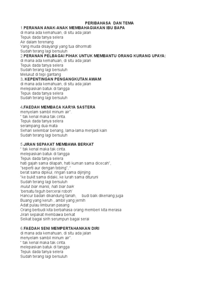 Murid murid dapat mencari maksud peribahasa dan makna ayat tertentu termasuk simpulan bahasa perumpamaan bidalan pepatah dan sebagainya di jadual bawah. Dua orang atau pihak yang sama darjat dalam adat 12. Para pelajar boleh menggunakan peribahasa seperti di bawah bagi mengindahkan lagi penulisan karangan. Peribahasa melayu yang paling popular setiap hari.