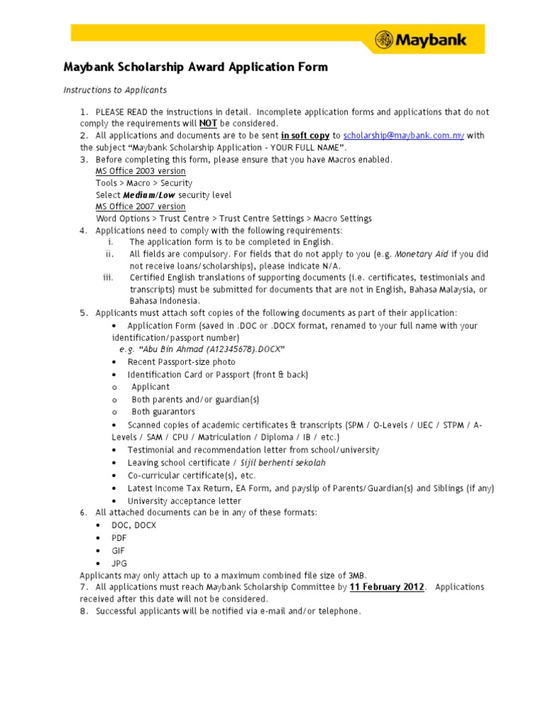 Minimum 6as in spm 2015 or equivalent. Please list if you have relatives working in maybank group. The scholarship awards incorporate the bank s csr philosophy of growing with responsibility assisting those who excel to complete their tertiary studies and pursue a career with the nation s largest financial services group. Scholarship award 2016 application form scholarship options.