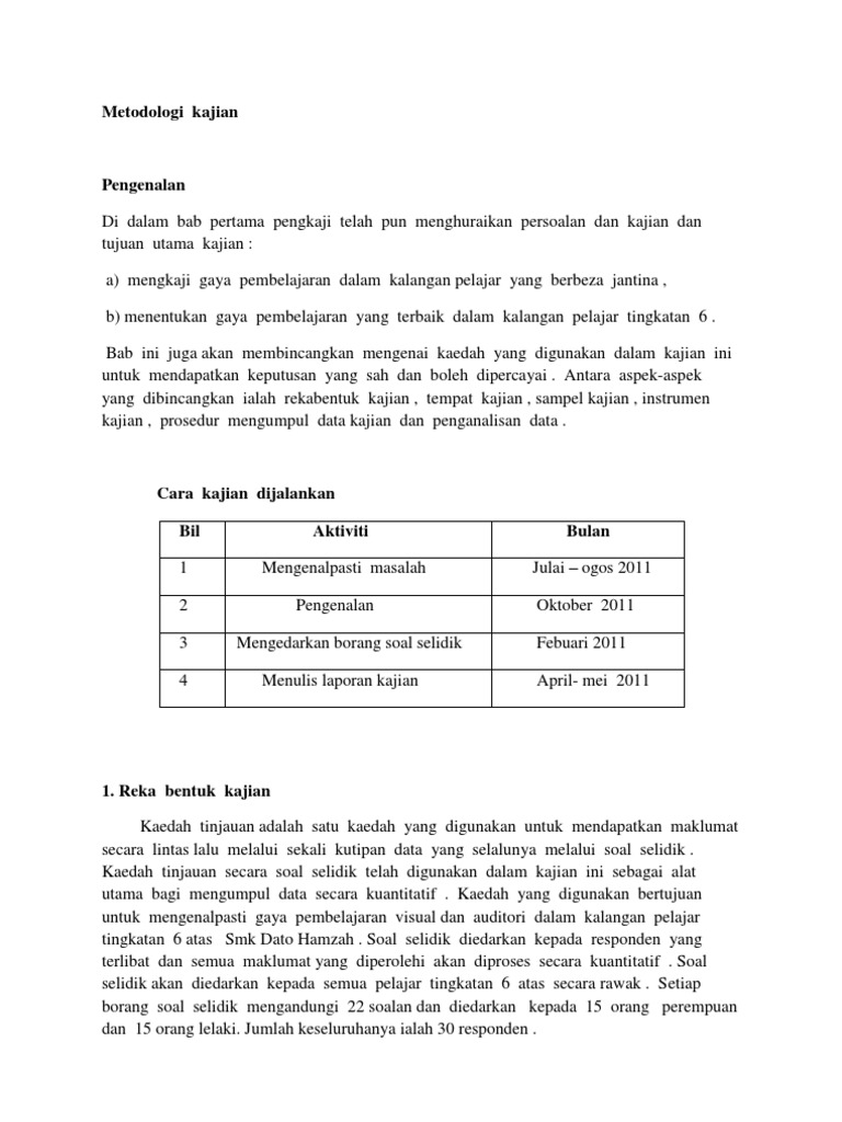 Ia termasuk jumlah penyelidik yang rendah dan jumlah responden yang tinggi. 1 kaedah soal selidik samb 1 6 2 soal selidik diserahkan secara pos kiriman kelebihan dapat mengukur lebih banyak subjek menjimatkan masa belanja dan tenaga kelemahan sukar mendapatkan kerjasama subjek menjawab dengan lengkap serta memulangkan kembali soalselidik. Metodologi penyelidikan 3 1 pendahuluan. 3 4 2 perbualan antara informan dan pengkaji akan dirakam dan disimpan dalam perisian sound.