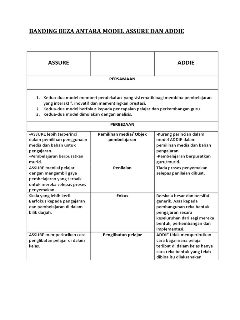 Model assure reka bentuk pengajaran. Sasaran dan tujuan pengajaran hendaknya dinegosiasikan beri alat dan lingkungan yang membantu pebelajar dalam menginterpretasikan perspektif ganda terhadap dunia nyata. Microsoft word nota model assure author. Bilangan murid seramai 31 orang.