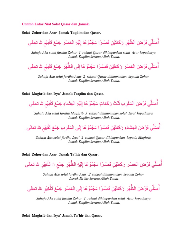 Niat solat jamak dan qasar. Zuhur empat rakaat dan asar empat rakaat. Berikut pula ialah panduan niat untuk melakukan solat jamak takdim dengan qasar. Rukhsah solat adalah kemudahan atau keringanan yang dibolehkan buat orang islam yang bermusafir untuk menunaikan solat secara qasar dan jamak. 2 niat solat jamak takdim dengan qasar seperti yang dimaklumkan di atas niat dalam bahasa arab itu sunat.