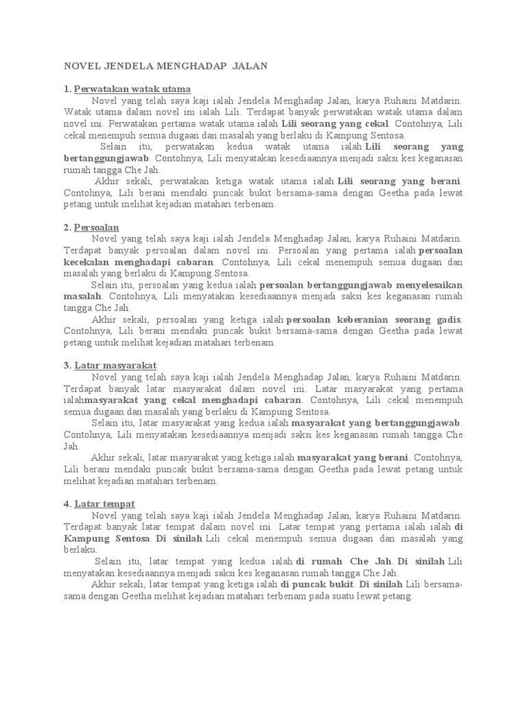 Berdasarkan novel yang telah saya kaji iaitu novel jendela menghadap jalan karya ruhaini matdarin saya berpendapat bahawa wajar novel ini berakhir sedemikian melalui peristiwa menyelesaikan isu berkaitan kubah surau lili danel dan geetha berjaya menyelesaikan isu berkaitan kubah surau yang dihadapi oleh penduduk di kampung sentosa. Sinopsis tema persoalan. Novel jendela mengadap jalan bab. Pengenalan novel jendela menghadap jalan tingkat.