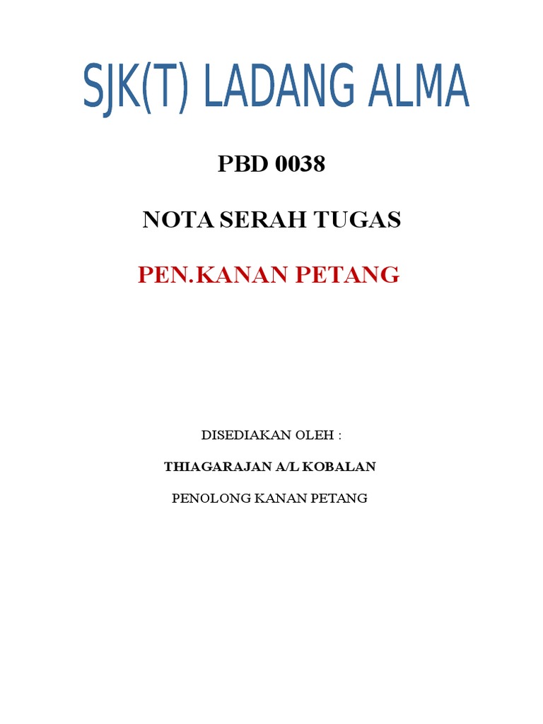 Format nota serah tugas kandungan perkara mukasurat 1. Nota serah tugas pertukaran guru garis panduan penyediaan nota serah tugas ini disediakan bagi memberi panduan untuk membantu pihak pengurusan dan agensi agensi dibawah termasuk pejabat pelajaran daerah dan sekolah sekolah menyediakan nota serah tugas yang seragam dan sesuai mengikut format yang digunakan oleh semua kementerian dan jabatan kerajaan. Nota serah tugas untuk digunapakai oleh guru yang dapat bertukar. 11 adalah saya md khirom bin ab.
