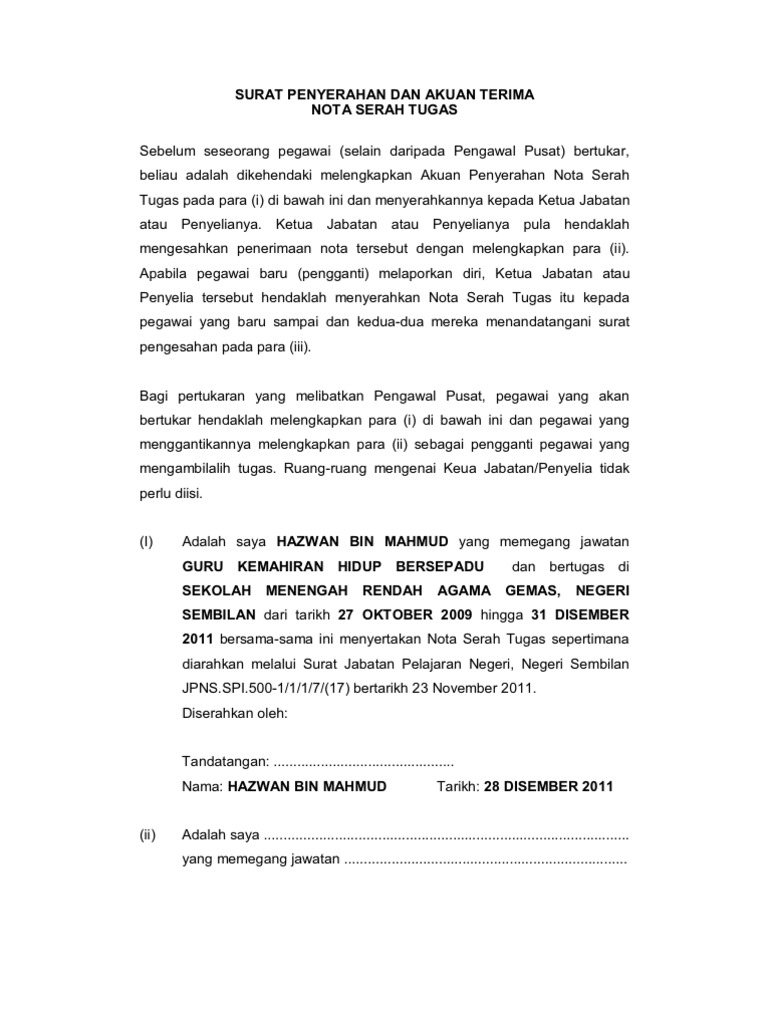 Nota serah tugas pertukaran guru garis panduan penyediaan nota serah tugas ini disediakan bagi memberi panduan untuk membantu pihak pengurusan dan agensi agensi dibawah termasuk pejabat pelajaran daerah dan sekolah sekolah menyediakan nota serah tugas yang seragam dan sesuai mengikut format yang digunakan oleh semua kementerian dan jabatan kerajaan. Kumpulan contoh nota serah tugas guru sekolah rendah terbaik 2019. The collection that consisting of chosen picture and the best among others. Garis panduan penyediaan nota serah tugas ini disediakan bagi memberi panduan untuk membantu pihak pengurusan dan agensi agensi dibawah termasuk pejabat pelajaran daerah dan sekolah sekolah menyediakan nota serah tugas yang seragam dan sesuai mengikut format yang digunakan oleh semua kementerian dan jabatan kerajaan.