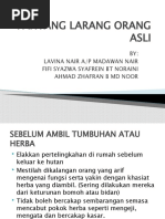 Pantang larang masyarakat asli 1. Pantang larang kepada pengunjung selain pantang larang ini diamalkan oleh kaum orang asli para pengunjung atau tetamu yang berkunjung ke rumah orang asli hendaklah menghormati adat adat dan kepercayaan mereka seperti tidak boleh naik sebelum dipelawa dan dilarang mengunjungi atau memanggil nama tuan rumah yang mempunyai daun daun yang bergantung di hadapan pintu. Zurina ain binti ibrahim nur izzati binti ibrahim nurul fareha binti nizamuddin rabiatul zahidah binti mohd zaidi 2. Semua pantang larang ini perlu dipatuhi untuk kesejahteraan kehidupan mereka.