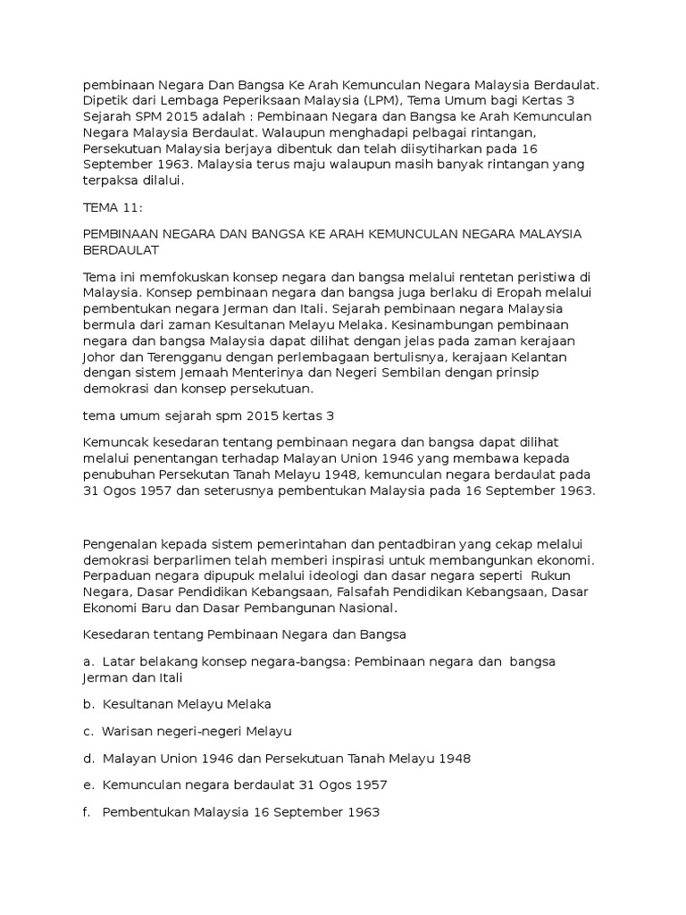 Pembinaan negara dan bangsa malaysia ke arah kemunculan negara malaysia yang berdaulat pengenalan malayan union di tanah melayu pada tahun 1946 telah menunjukkan penyatuan masyarakat terhadap penjajahan british. Pembinaan negara dan bangsa ke arah kemunculan negara malaysia berdaulat. Jelaskan kemunculan gerakan nasionalisme di asia tenggara dan kaitannya. Sejarah kertas 3 skema jawapan pembinaan negara dan bangsa malaysia panduan buat pelajar sijil pelajaran malaysia spm.