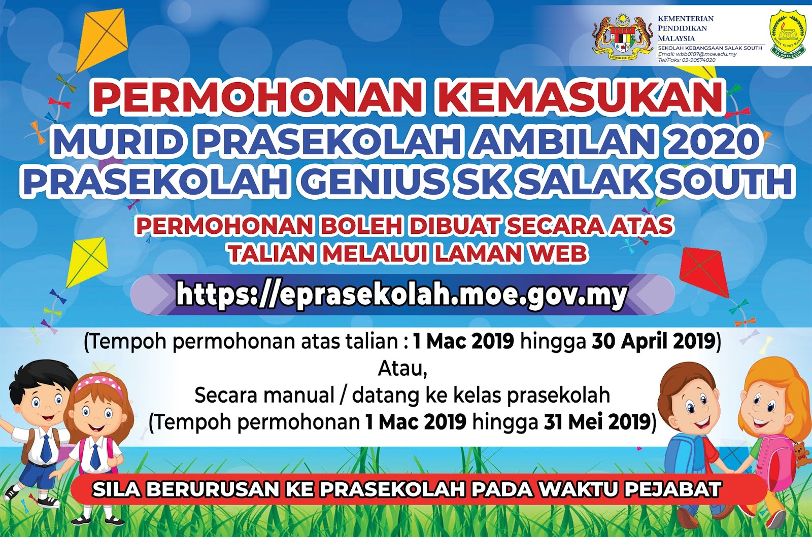 Pendaftaran pra sekolah 2019 2020. Berikut dikongsikan adalah maklumat penting tentang permohonan prasekolah kpm 2019 termasuk memaparkan tarikh permohonan syarat kelayakan dan aplikasi online. Ibubapa penjaga yang telah berjaya membuat pendaftaran permohonan secara atas talian online dengan mengisi butiran diperlukan dalam sistem aplikasi e prasekolah serta mencetak bukti permohonan online berkenaan perlu menghantarkan cetakan borang permohonan beserta dokumen yang berkaitan ke sekolah yang dipohon selewat lewatnya 31 mei 2020 dilanjutkan sehingga 15 jun 2020. Senarai sekolah seluruh malaysia manakalah ibu bapa yang membuat pendaftaran secara atas talian online. Pendaftaran prasekolah 2020 online kpm akan dibuka bermula dari 1 mac 2019 sehingga 30 april 2019.