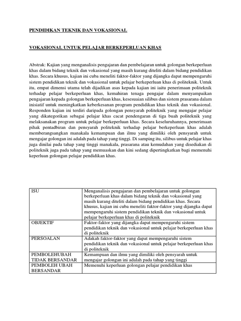 Articles citing pendidikan teknik dan vokasional untuk pelajar berkeperluan khas. Kecenderungan pelajar berkeperluan khas di politeknik dalam menceburi bidang keusahawanan. Untuk memahami apa itu pendidikankhas adalah wajar kita meninjau beberapa definisi yang dikemukankan oleh pakar pakar dalam bidang hallahan dan kauffman 2006. Penilaian tetap di utamakan untuk mereka mengikut tahap persekolahan mereka.