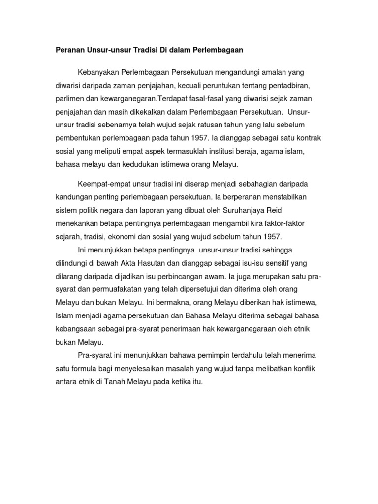 Ia dianggap sebagai satu kontrak sosial yang meliputi 4 aspek termasuklah institusi beraja agama islam bahasa melayu dan kedudukan istimewa orang melayu. Mohd salleh abas 1985. Unsur unsur tradisi sebenarnya telah wujud sejak ratusan tahun yang lalu sebelum pembentukan perlembagaan pada tahun 1957. Unsur unsur tradisi sebenarnya telah wujud sejak ratusan tahun yang lalu sebelum pembentukan perlembagaan pada tahun 1957.