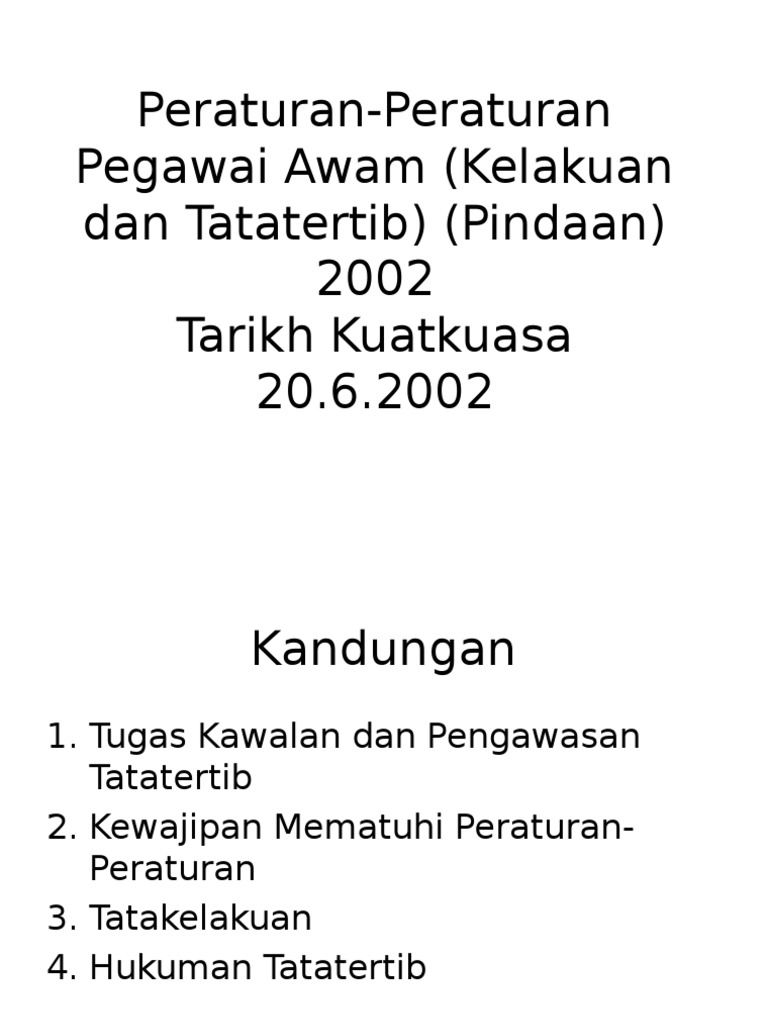 Peraturan peraturan pegawai awam kelakuan dan tatatertib pindaan 2007. Peraturan ini mengandungi peraturan dan kelakuan yang boleh dan tidak boleh dilakukan oleh seseorang pegawai awam. Peraturan peraturan pegawai awam kelakuan dan tatatertib pindaan 2006 p u. Peraturan peraturan pegawai pegawai kerajaan kelakuan dan tatatertib akta suruhanjaya perkhidmatan awam penggal 83. Peraturan peraturan pegawai awam kelakuan dan tatatertib 1993 by malaysia 1998 diterbit dicetak oleh mdc penerbit pencetak edition in malay cet.