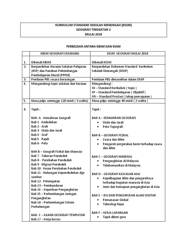 Perbezaan geografi dalam kbsm dan kssm. 1 3 mendengar dan memahami maklumat fakta. Sivik dan kewarganegaraan psk 2 7 pendidikan islam 3 1 2 6 pendidikan islam 4 2 pendidikan moral 3 pendidikan moral 3 8 geografi 3 7 geografi 3 9 pend. Reka bentuk kurikulum 6. Mata pelajaran waktu 1 bahasa malaysia 6 1 bahasa malaysia 6 2 bahasa inggeris 5 2 bahasa inggeris 6 3 matematik 5 3 matematik 5 4 sains 5 4 sains 5 5 sejarah 3 5 sejarah 3 6 pend.