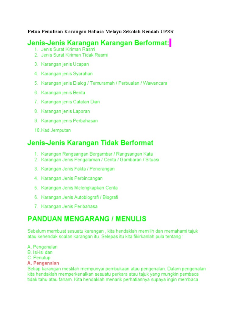 Bagi karangan berformat ia terdiri daripada karangan berita karangan ucapan atau karangan syarahan atau karangan. Oleh itu pastikanlah terlebih dahulu pembukaan karangan hendaklah bersih daripada kesalahan tatabahasa atau ejaan.