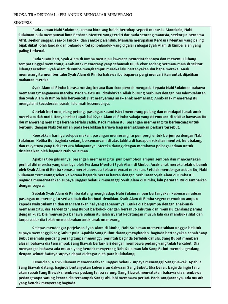 Sinopsis tema dan persoalan binaan plot teknik plot watak perwatakan latar tempat masyarakat masa gaya bahasa nilai dan pengajaran sinopsis prosa tradisional pelanduk mengajar memerang pada zaman nabi allah sulaiman semua haiwan ditakdirkan oleh allah dapat berkata kata. Prosa tradisional pelanduk mengajar memerang. 7 2 memerang atau sang memerang a mempunyai tujuh orang anak. Prosa tradisional pelanduk mengajar memerang k.