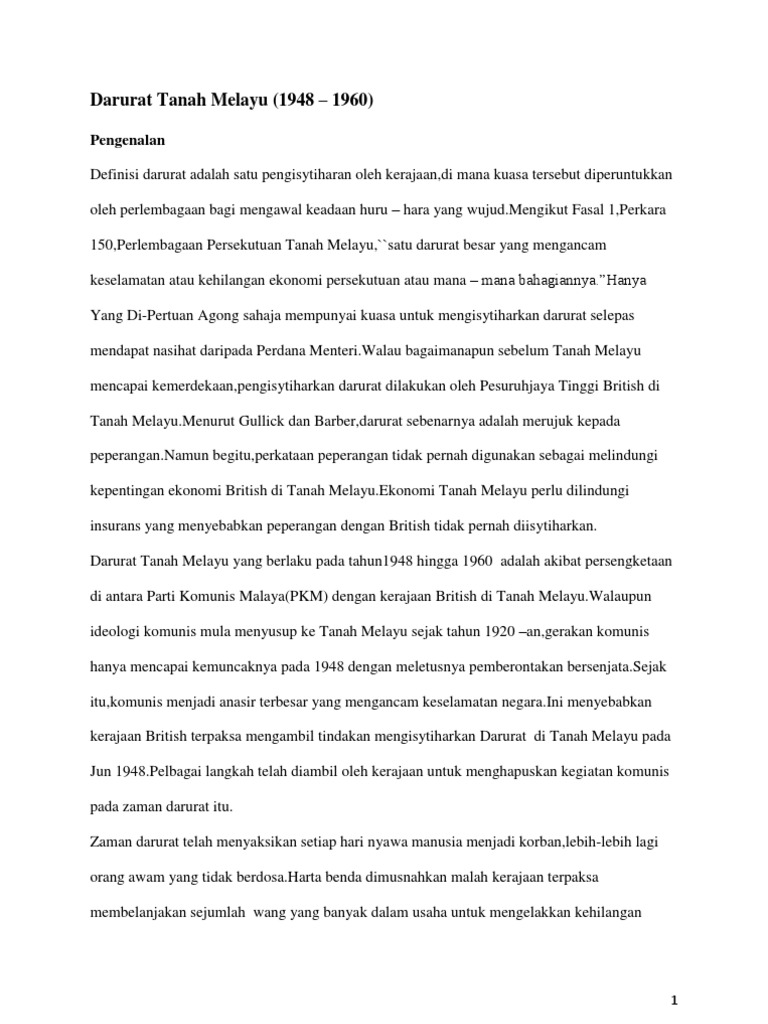 Darurat tanah melayu merupakan darurat yang telah diisytiharkan oleh kerajaan british di malaya dari tahun 1948 hingga tahun 1960 darurat ini diikuti dengan penarikan hak hak sivil pemberian kuasa istimewa kepada pihak polis dan langkah langkah lain yang bertujuan untuk mengongkong kegiatan politik haluan kiri terutamanya parti komunis malaya pkm. Punca darurat bolehlah dikatakan bahawa segala bermula selepas pendudukan jepun 1942 1945. Dengan itu anggota pkm mula meresapi pelbagai pertubuhan politik belia dan kesatuan sekerja di samping bergiat cergas dalam pkm yang masih halal ketika itu. Strategi dan kesan terhadap kedah abstrak kajian ini melihat kedah dalam era darurat memberi penumpuan kepada segala apa yang berlaku sepanjang tahun 1948 hingga 1960.