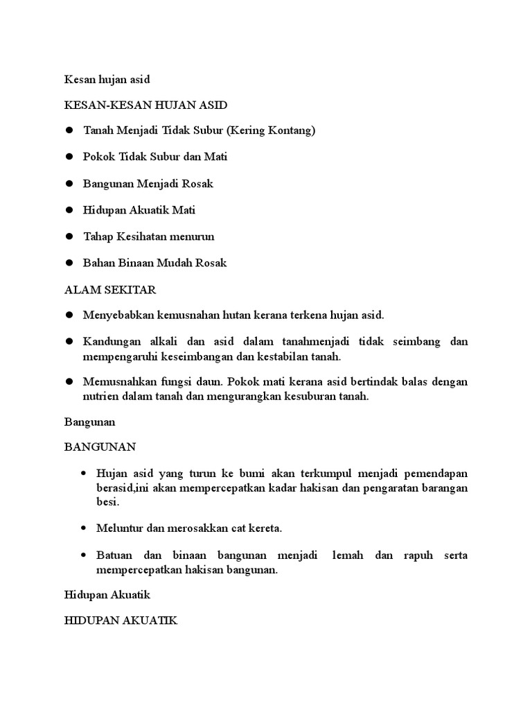 1990 telah menunjukkan bahawa pencemaran gas gas beracun menjadi punca utama hujan asid temtamanya di kawasan bandar. Jabatan meteorologi malaysia pertaling jaya. 70 hutan di czechslovakia musnah akibat hujan asid ini. Nilai ph kurang daripada 6 akan menyebabkan bahan bahan organik tanah mati maka tanah ini menjadi tidak subur dengan ketiadaan nutrien di dalamnya.