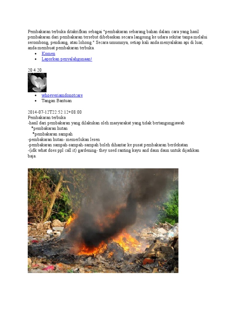 Punca pembakaran sampah secara terbuka. Pembakaran sampah di area terbuka dapat menghasilkan partikel debu halus atau particulate matter pm yang mencapai level pm 10 10 mikron. Pembakaran secara terbuka tanpa kawalan juga menyebabkan keadaan jerebu menjadi semakin serius. Ini cara buatkan seseorang tu didenda rm500k sebab bakar sampah secara terbuka. Di sisi lain pembakaran sampah memberikan dampak negatif bagi lingkungan dan kesehatan.