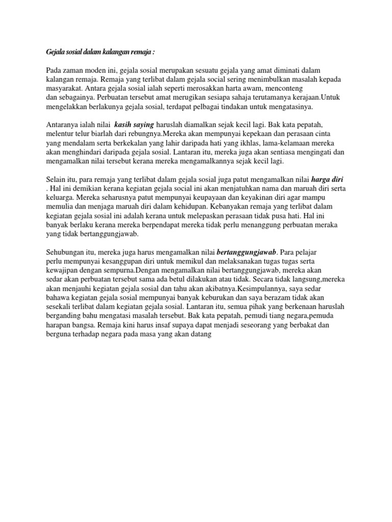 Masalah seperti penagihan dadah salah laku pelajar pergaulan bebas dan sebagainya semakin berleluasa dan kian meningkat. Baca petikan di bawah dengan teliti. Pelbagai andaian hujah cadangan program dan aktiviti bagi menangani masalah sosial ini diutarakan. Antara masalah sosial remaja masa kini ialah merempit ragut curi motosikal menagih dadah dan pergaulan bebas.