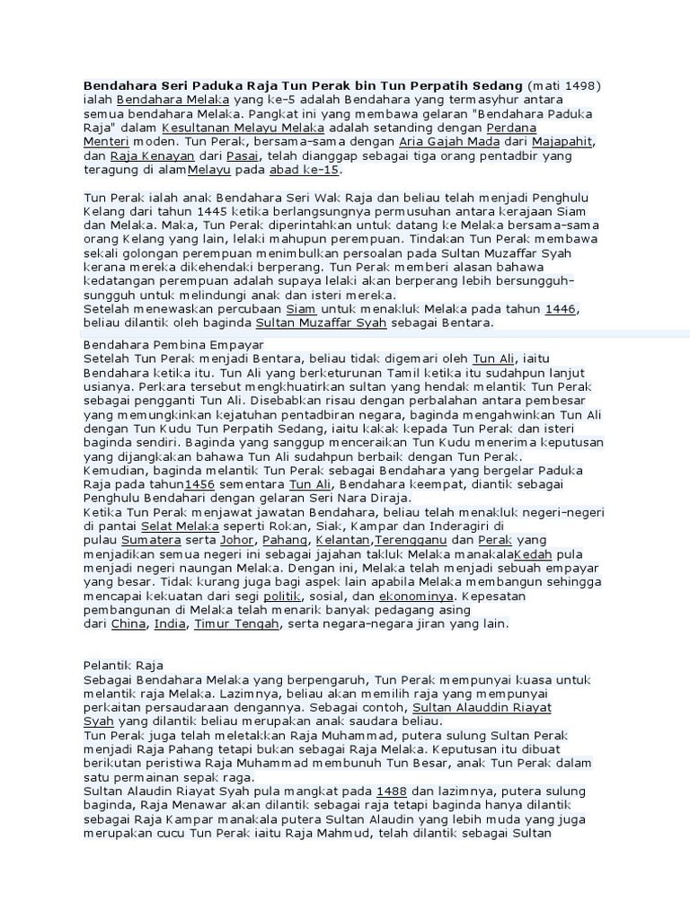 Riwayat hidup bendahara tun perak. Riwayat hidup tun perak other contents. Tun perak nama bapa. Tun perak mengetuai angkatan perang melaka dan menewaskan angkatan perang siam dekat batu pahat. Bendahara paduka rajaperanan tun perakmempertahankan kesultanan melayu melaka daripada serangan siam sebanyak dua kalimembangunkan melaka sebagai pusat perdaganganmenjalankan tugas.