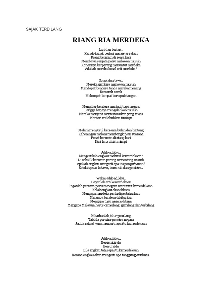 Hari ini mentari 31 ogos memancar lagi bersama gemersik angin di bumi bertuah mendewasakan ukhuwah dan ummah siap siaga warga berdaulat memahat sejarah dalam tamadun bangsa yang gah. Sajak yang ditulis oleh lily ini mengisahkan perjalanan dan juga impian yang kanak kanak inginkan di dalam hidup mereka. Di malaysia sambutan hari kanak kanak disambut pada hari sabtu minggu keempat di bulan oktober pada setiap. Minta izin untuk gunakan sajak ibu dan ayah untuk dideklamasikan di sekolah saya.