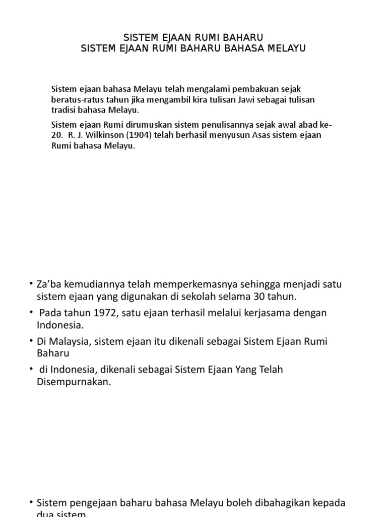 Topik 7 sejarah perkembangan sistem ejaan rumi w bahasa melayu 137 jadual 7 4. Sistem ejaan rumi baharu bahasa melayu sistem ejaan bahasa melayu telah engalami pembakuan sejak beratus ratus tahun jika mengambil kira tulisan jawi sebagai tulisan tradisi bahasa melayu. Umum bahasa malaysia pada tahun 1975. Untuk memantapkan sistem dan struktur dalaman bahasa melayu iaitu supaya sistem sebutan menjadi mantap dan baku sejajar dengan pemantapan dan pembakuan tatabahasa kosa kata perbendaharaan kata umum dan istilah sistem ejaan dan laras bahas.