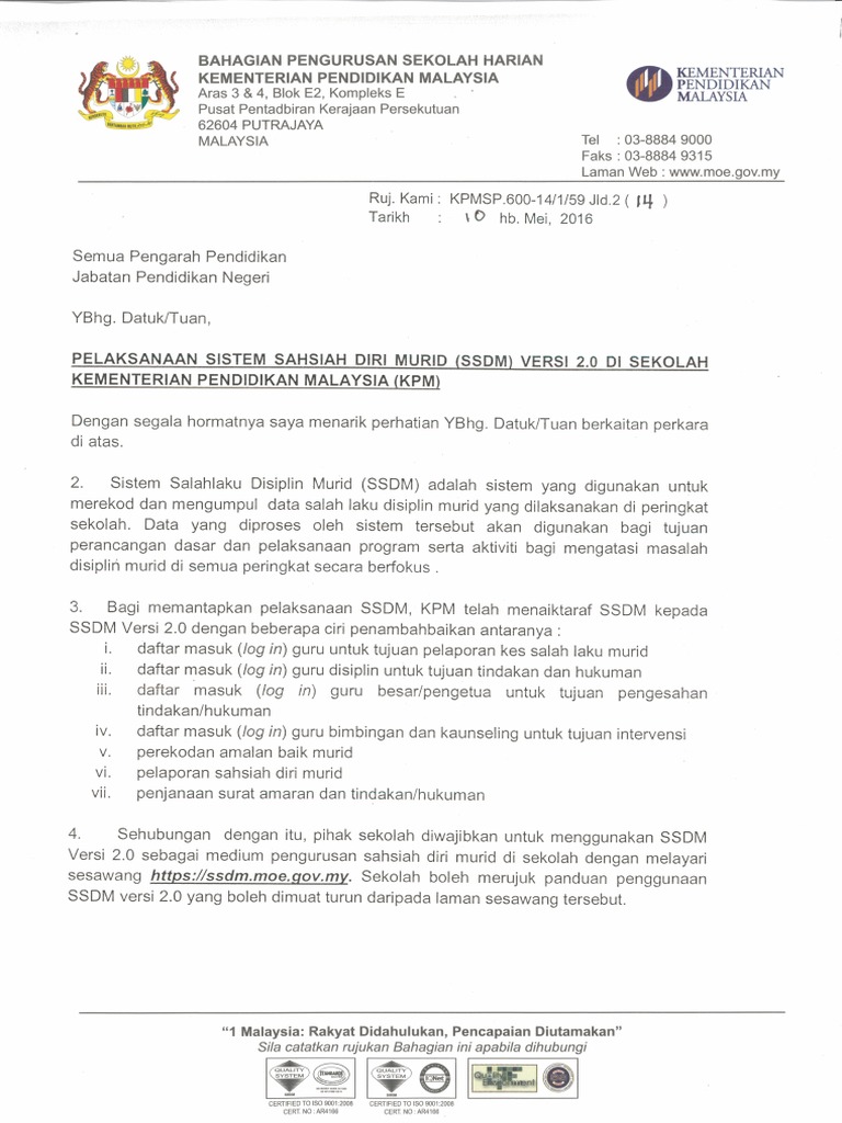 Bersama ini dilampirkan surat dari pejabat pendidikan daerah kota tinggi no. Kadangkala kes yang dibuat oleh pelajar perlu dipantau kerana kemungkinan ia berulang dan berada pada tahap membimbangkan. Pelaksanaan sistem sahsiah diri murid ssdm versi 2 0 di sekolah kementerian pendidikan malaysia. Rujukan jpa3005 06 19 1 11 91 untuk makluman dan tindakan tuan.