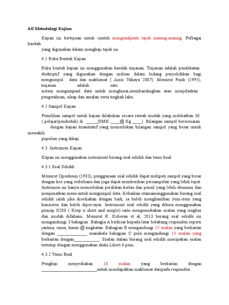 Soal selidik serta data kualitatif daripada hasil temu bual. Metodologi kajian 3 1 pengenalan menurut ahmad mazhab ayob 1985 19 kaedah kajian ialah soal bagaimana tiap tiap suatu objektif atau penyelidikan itu hendak dicapai. 4 3 1 pemerhatian pengkaji telah membuat pemerhatian terhadap tempat kajian sebelum mendapat responden. Banyak orang yang sedang mengikuti soal selidik contoh penulisan metodologi kajian serta sahaya ada di web web ini menyisihkan informasi soal selidik contoh penulisan metodologi kajian yang hendak bermakna bagi kamu.