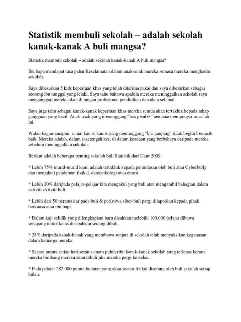 Statistik kes buli di malaysia pdf. Anda boleh mendapatkan maklumat berkenaan daripada. Laporan akhbar mengenai kes kes pelanggaran disiplin keganasan dan buli yang berlaku di sekolah sekolah menengah kebangsaan merupakan perkara biasa pada hari ini dan merupakan. A case study of north kedah perlis felda territory malaysia junainor hassan1 salleh abd rashid2 suliadi firdaus sufahani3. Kajian kes di kawasan felda utara kedah perlis malaysia bully among rural primary school students.