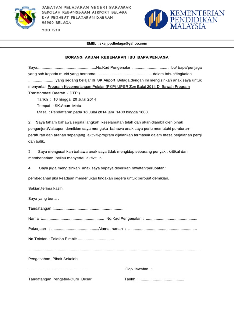 Surat akuan kebenaran ibu bapa penjaga menyertai aktiviti kokurikulum luar saya nama. Surat kebenaran pj sukan kokurikulum dalam tempoh pkpp 2020. Bapa ibu penjaga kepada anak yang bernama. Sk sultan yussuf 31000 batu gajah perak.