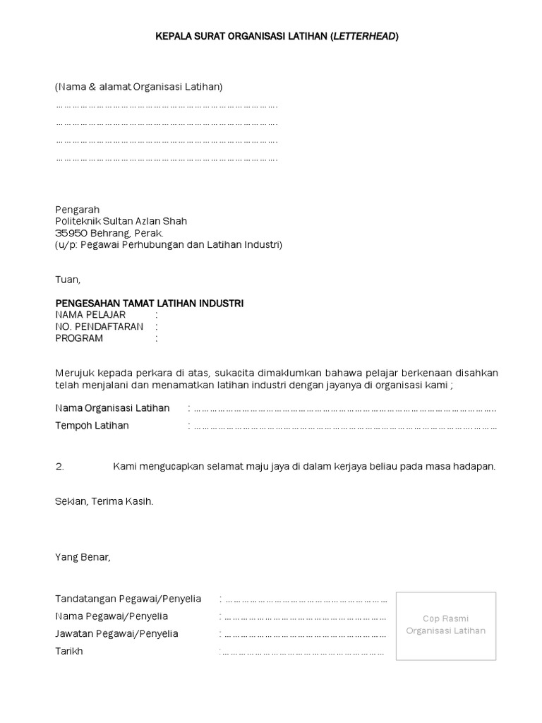 Contoh surat pengesahan majikan. Pegawai perhubungan latihan industri tuan pengesahan tamat latihan industri nama pelajar. Pengarah politeknik metro kuantan no. Kepala surat organisasi latihan pengesahan tamat latihan industri nama alamat organisasi.