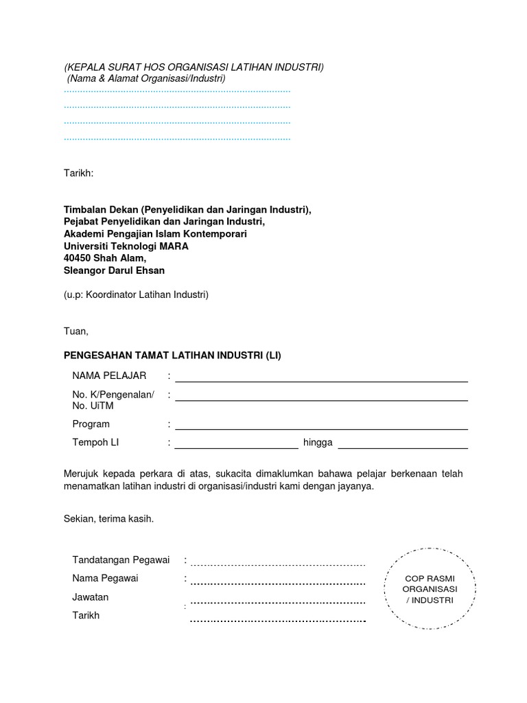 Edit ikut kesesuaian ruj. Timbalan dekan penyelidikan dan jaringan industri pejabat penyelidikan dan jaringan industri akademi pengajian islam kontemporari universiti teknologi mara 40450 shah alam sleangor darul ehsan u p. Kepala surat organisasi latihan pengesahan tamat latihan industri nama alamat organisasi tarikh. The collection that consisting of chosen picture and the best amongst others.