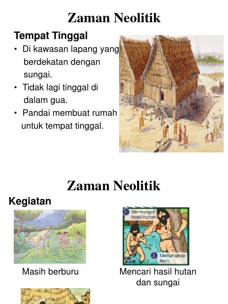 Ciri ciri kehidupan manusia zaman prasejarahhitempat kediamanzaman paleotikzaman mesolitikzaman neolitikzaman logam tempat kediamanzaman paleotiktempat tinggalbawah pokokguatempat yg diperbuat daripada ranting. Tempat kediaman orang mesolitik masih di gua bawah ranting kayu dan lubang bawah tanah. Zaman prasejarah di dunia biasanya dibahagikan kepada empat iaitu zaman paleolitik zaman mesolitik zaman neolitik dan zaman logam tempoh masa bagi setiap zaman tersebut tidak sama antara satu sama lain di tempat lain tempoh masa itu bergantung kepada tahap kemajuan di sesuatu tempat itu. Zaman ini berlangsung di antara 10 000 sm sehingga 5 000 sm.