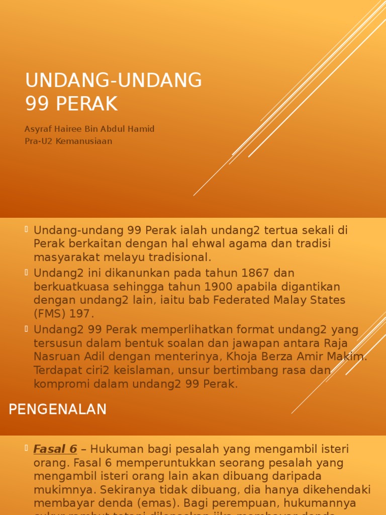 Undang undang 99 perak ialah undang undang tertua sekali di perak berkaitan dengan hal ehwal agama dan tradisi masyarakat melayu tradisional undang undang 99 perak dikanunkan pada tahun 1867 dan berkuatkuasa sehingga tahun 1900 apabila digantikan dengan undang undang lain iaitu bab federated malay states fms 197. Disusun dalam bentuk dialog yg dituturkan oleh raja nusyirwan dgn menteri buzurgmihr yg menjadi asas undang 2 99 perak mempunyai unsur adat perpatih yg mengandungi hampir semua perkara berkaitan hak pemerintah perhambaan jenayah pembahagian harta perkahwinan dan pertelingkahan kecil. View undang undang 99 perak pptx from psv 934 at sekolah menengah kebangsaan sultan ahmad tajuddin. Undang undang 99 perak ialah undang undang tertua sekali di perak berkaitan dengan hal ehwal agama dan tradisi masyarakat melayu tradisional undang undang 99 perak dikanunkan pada tahun 1867 dan berkuatkuasa sehingga tahun 1900 apabila digantikan dengan undang undang lain iaitu bab federated malay states fms 197.