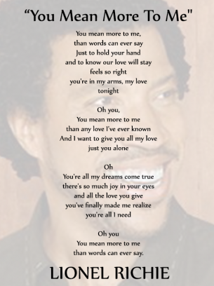 Lyrics to you mean more to me by lionel richie. Lionel richie you mean more to me lyrics video. You mean more to me than words can ever say just to hold your hand and to know our love will stay feels so right you re in my arms my love tonight oh you you mean more to me than any love i ve ever known and i want to give you all my love just you alone oh you re all my dreams come true there s so much joy in your eyes and all the love you give. Lyrics for you mean more to me by lionel richie.